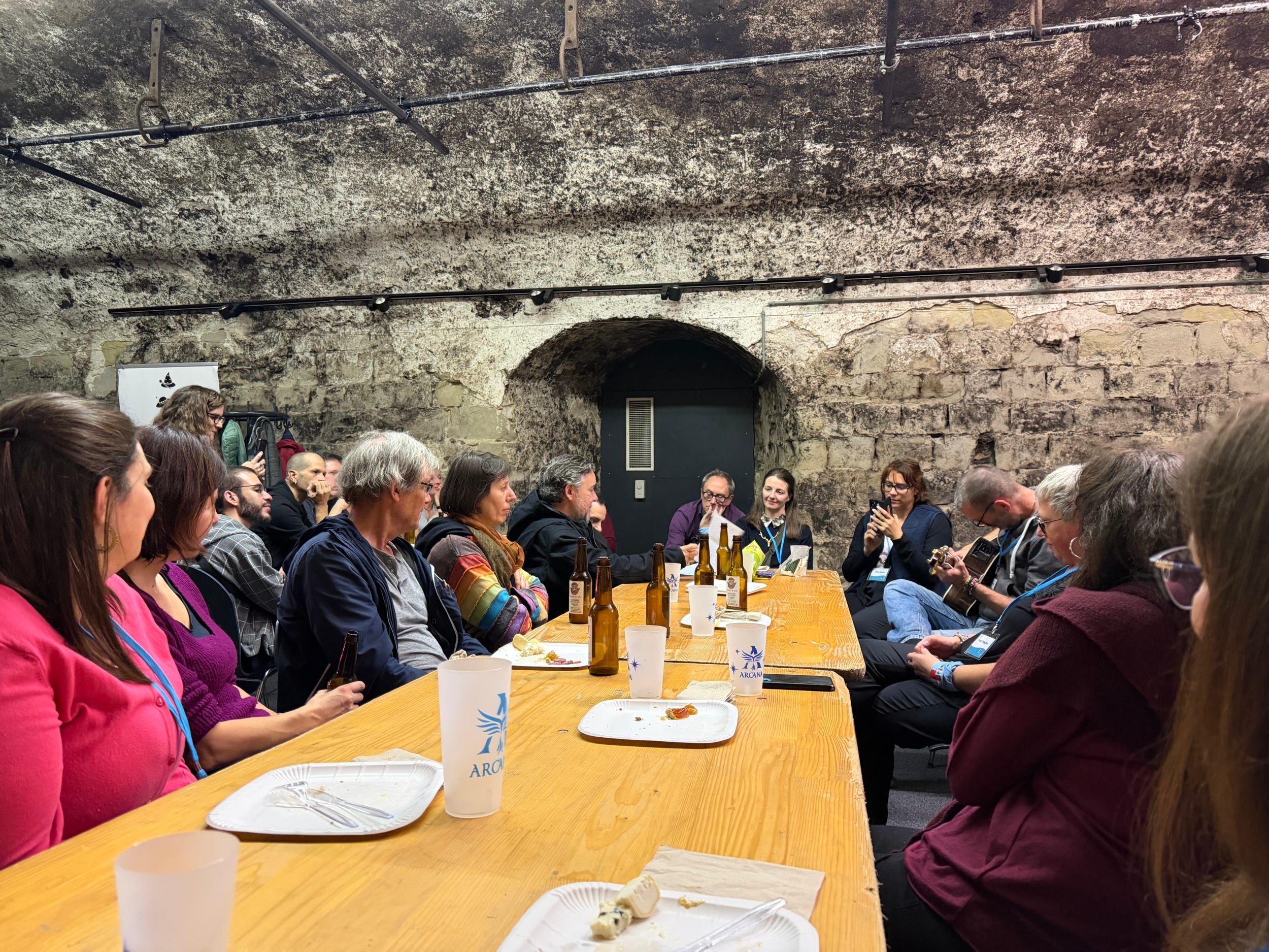 Le soir venu, l’équipe se retrouve pour manger dans les caves du château. David, accompagné de Lionel (l’autre) et Jean à la voix, nous régale d’un concert en jouant quelques titres de l’album qu’il a produit à partir de chanson présente dans les romans des membres.